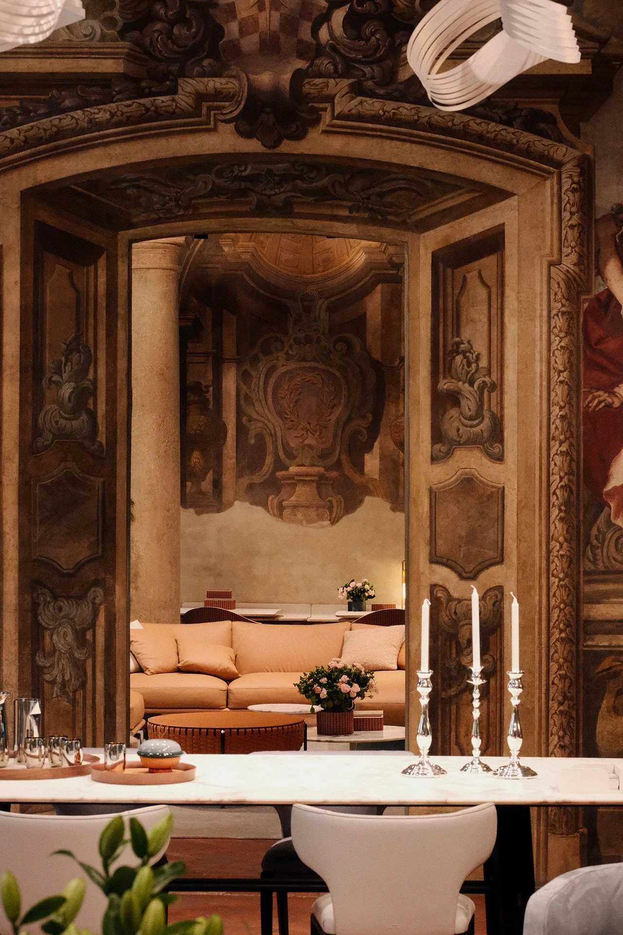 Interior of a luxurious living room with a beige sofa, floral arrangements, and ornate wall artwork visible through a large decorative archway.