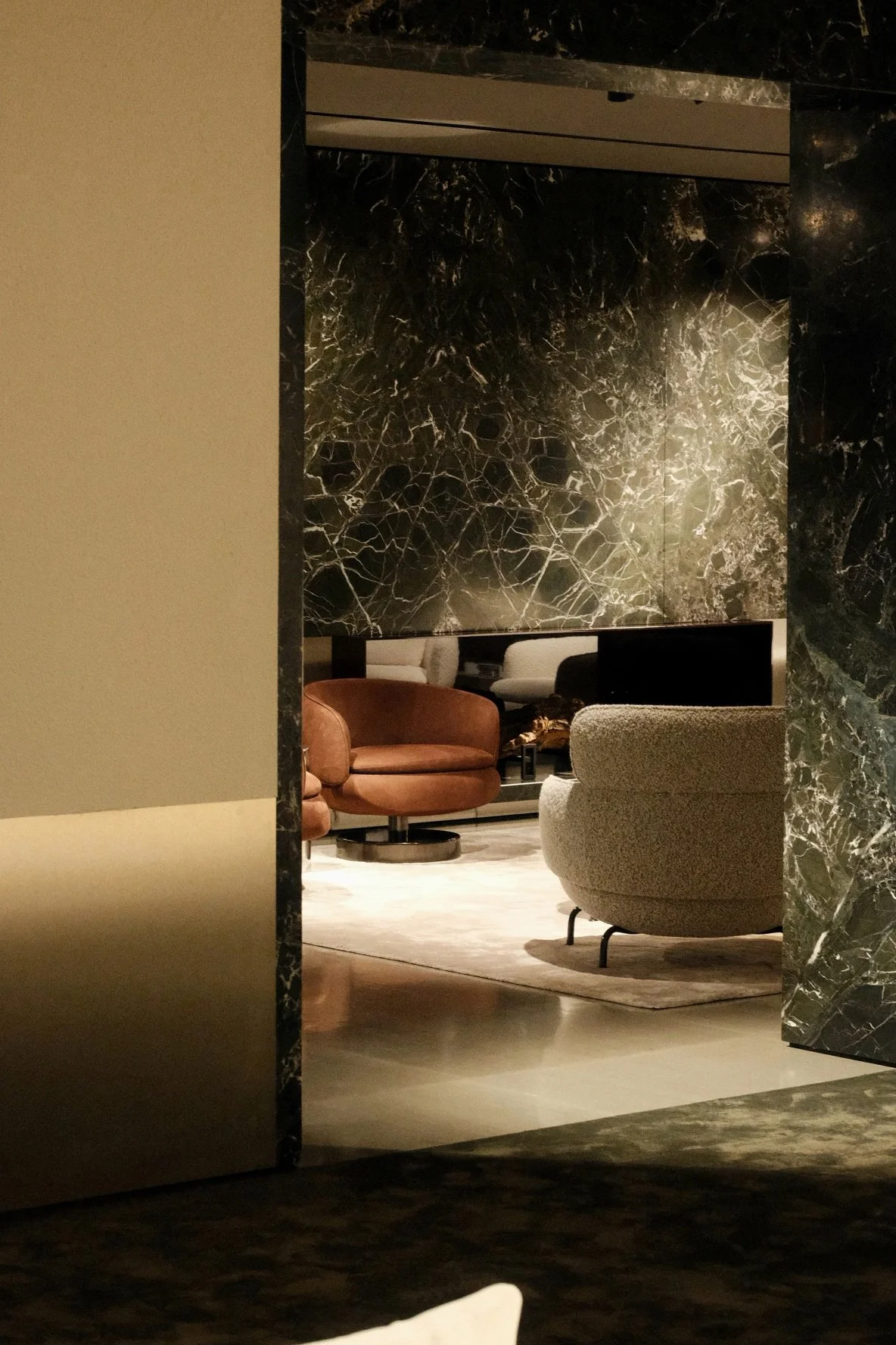 A view into a luxurious room with dark marble walls and a beige and brown color scheme, featuring plush modern chairs and a carpeted sofa, with soft lighting creating a cozy ambiance.