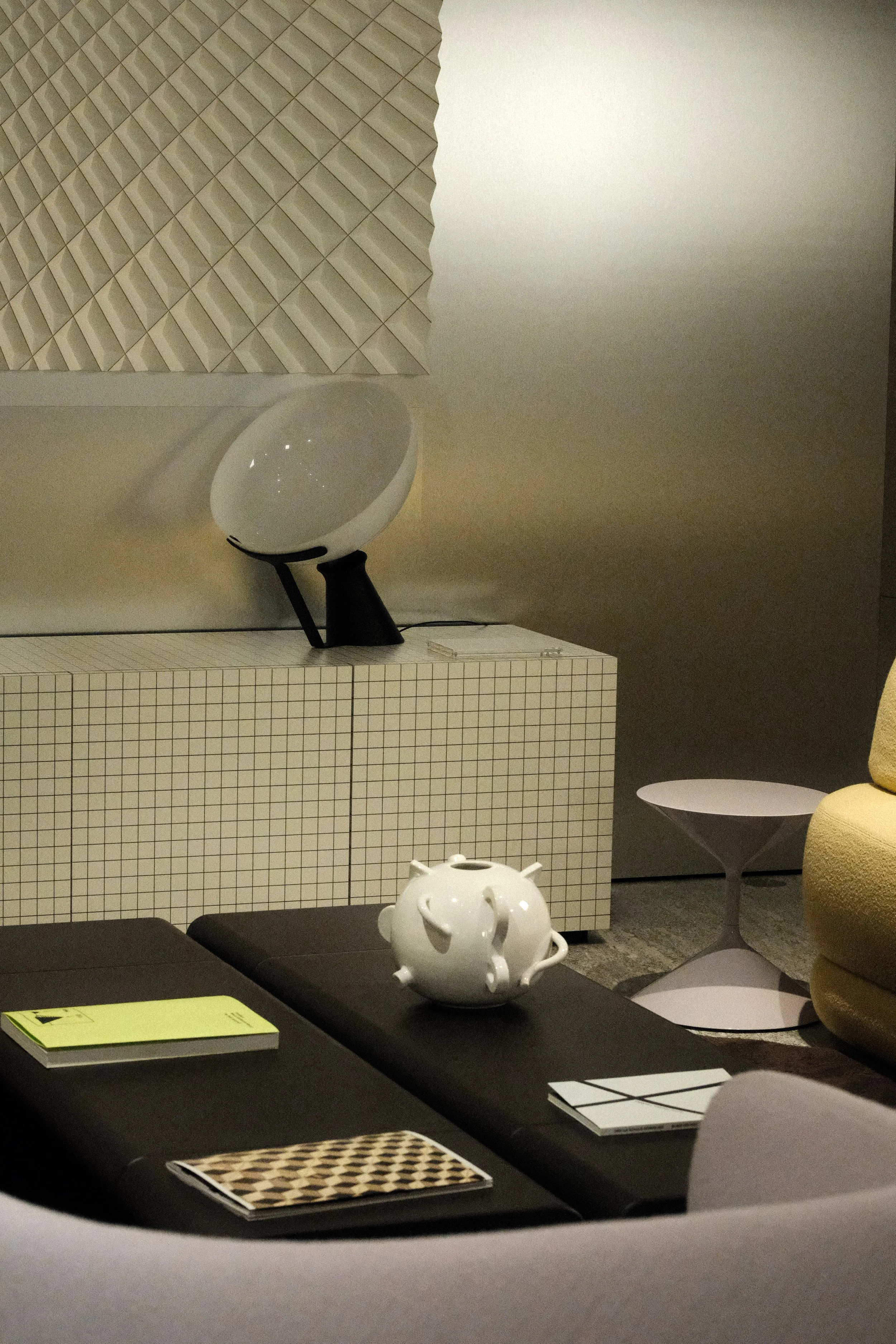 Modern interior with geometric decor. A black coffee table holds notebooks and a white ceramic decorative object. In the background, a patterned wall, a white buffet, and a unique lamp.