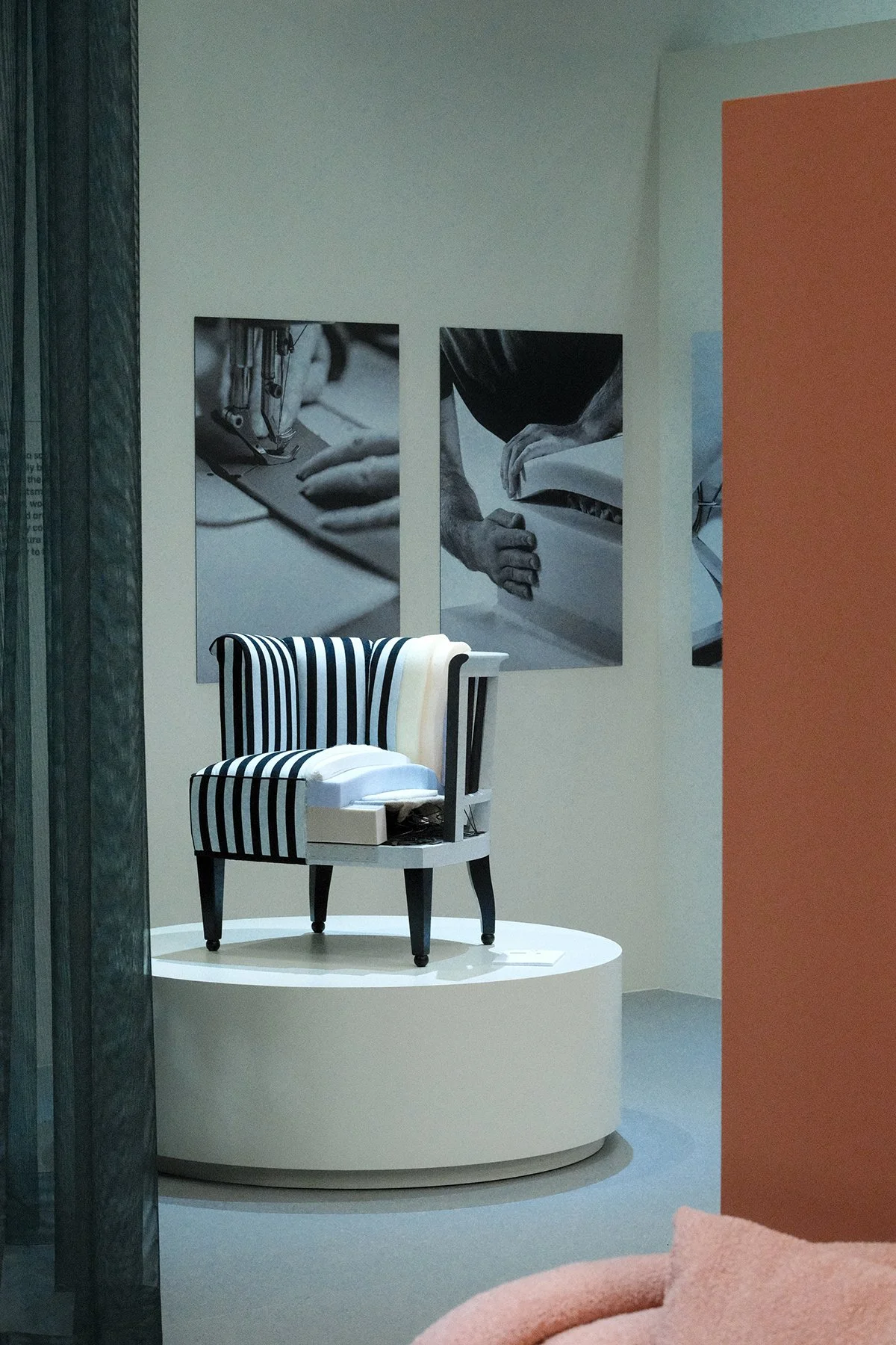 A black and white striped chair displayed on a white circular platform in an art gallery. Behind the chair, there are two black-and-white posters showing close-up images of sewing and upholstery work.