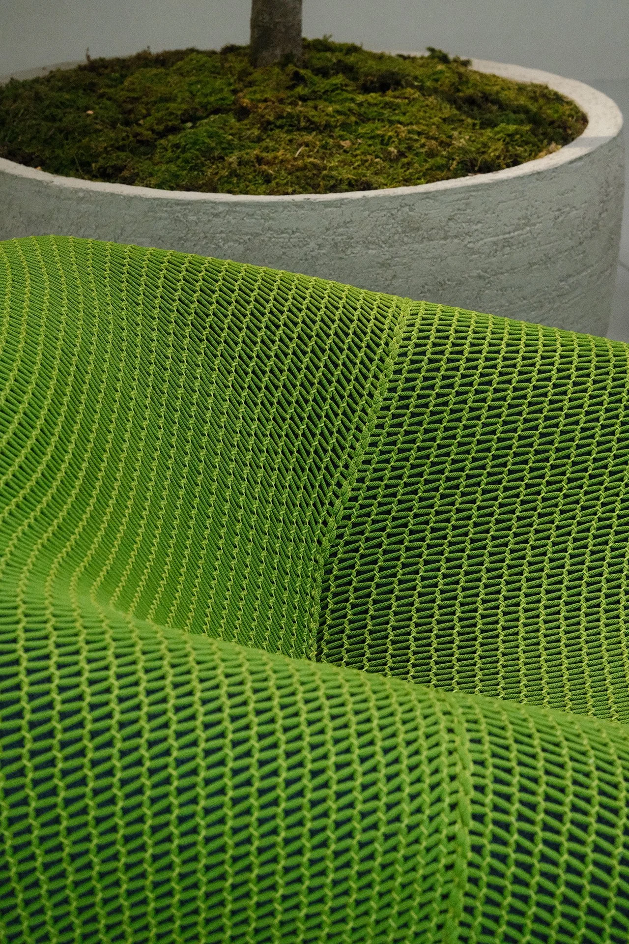 Close-up of a green-patterned mesh chair with a textured gray planter containing a small tree with moss on the soil surface.