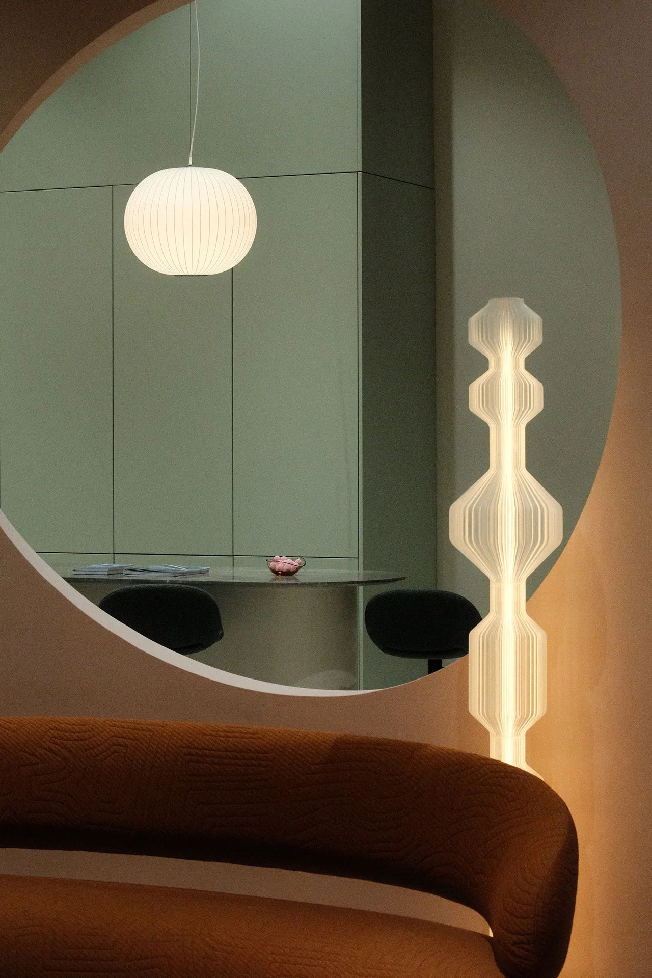 Interior view through a circular opening showing a room with green panels, a white hanging lamp, a decorative floor lamp, a table with magazines, and two black chairs.