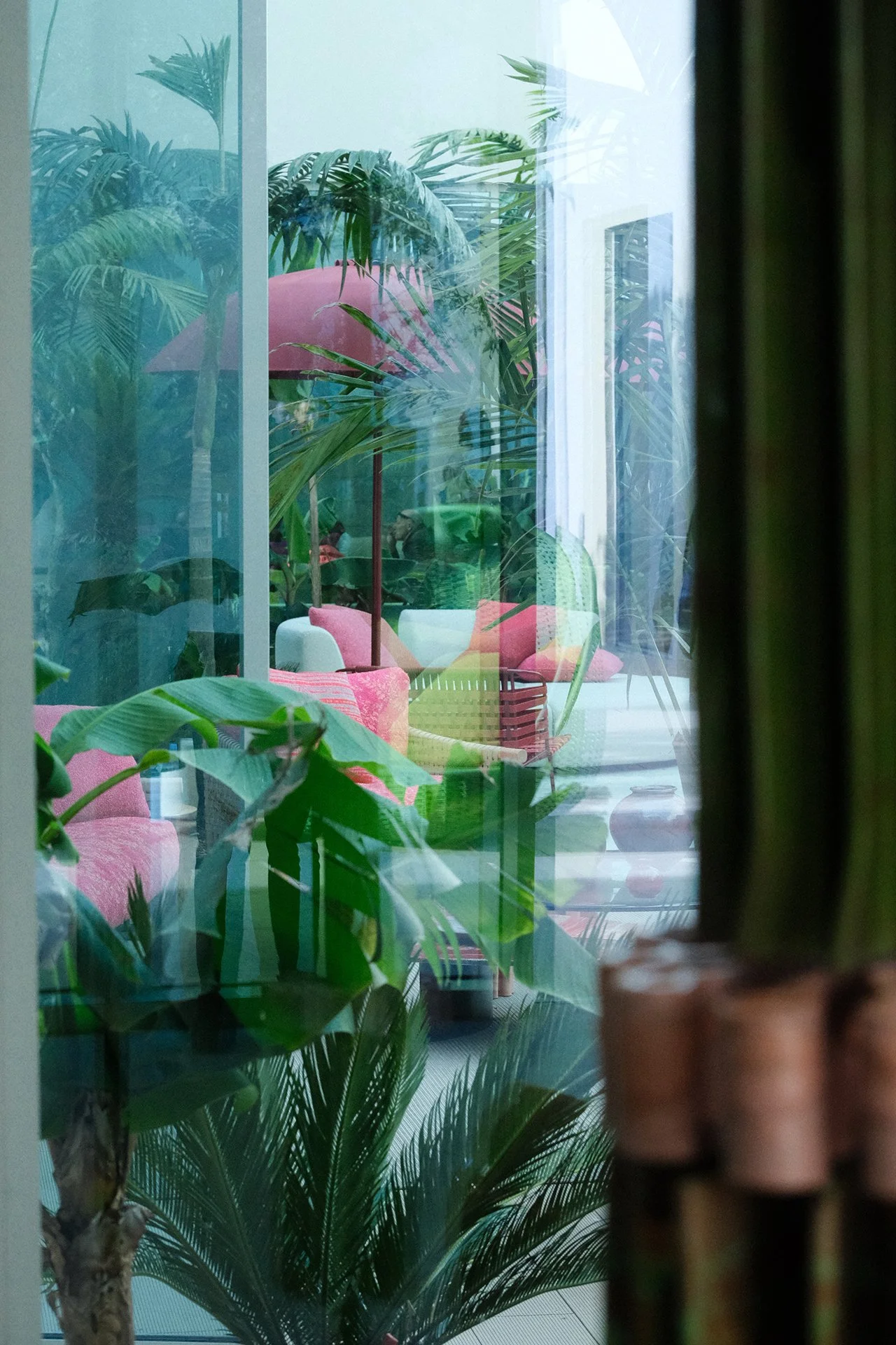 View through a glass window shows a room with green tropical plants, pink chairs, a pink umbrella, and a white side table in a cozy, modern interior.