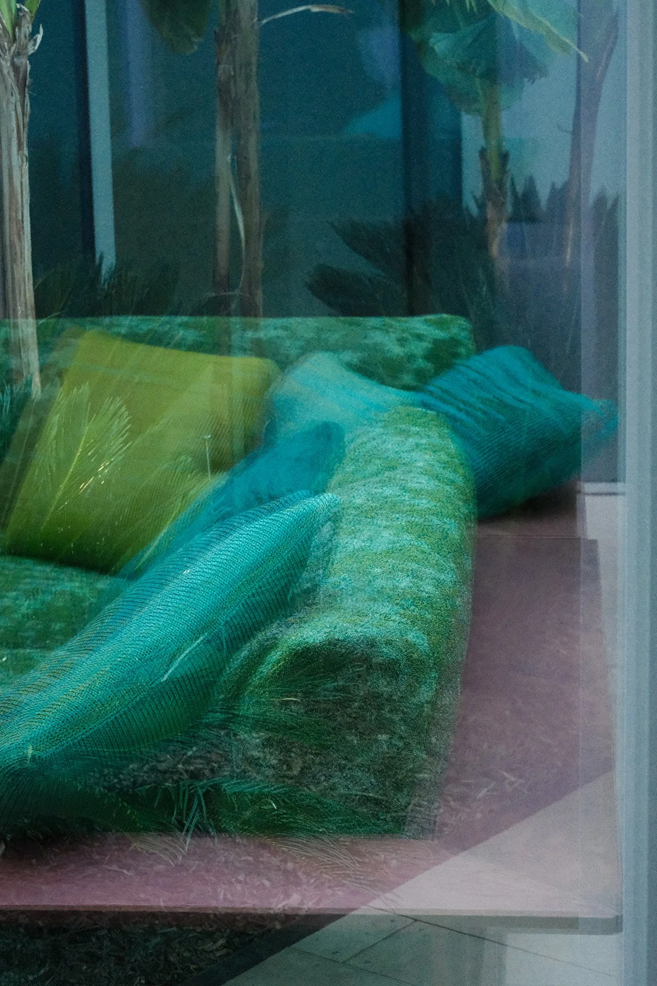 A reflection of a green woven couch with green pillows, a yellow pillow, and a blue throw, with a background of trees and plants seen through a window.