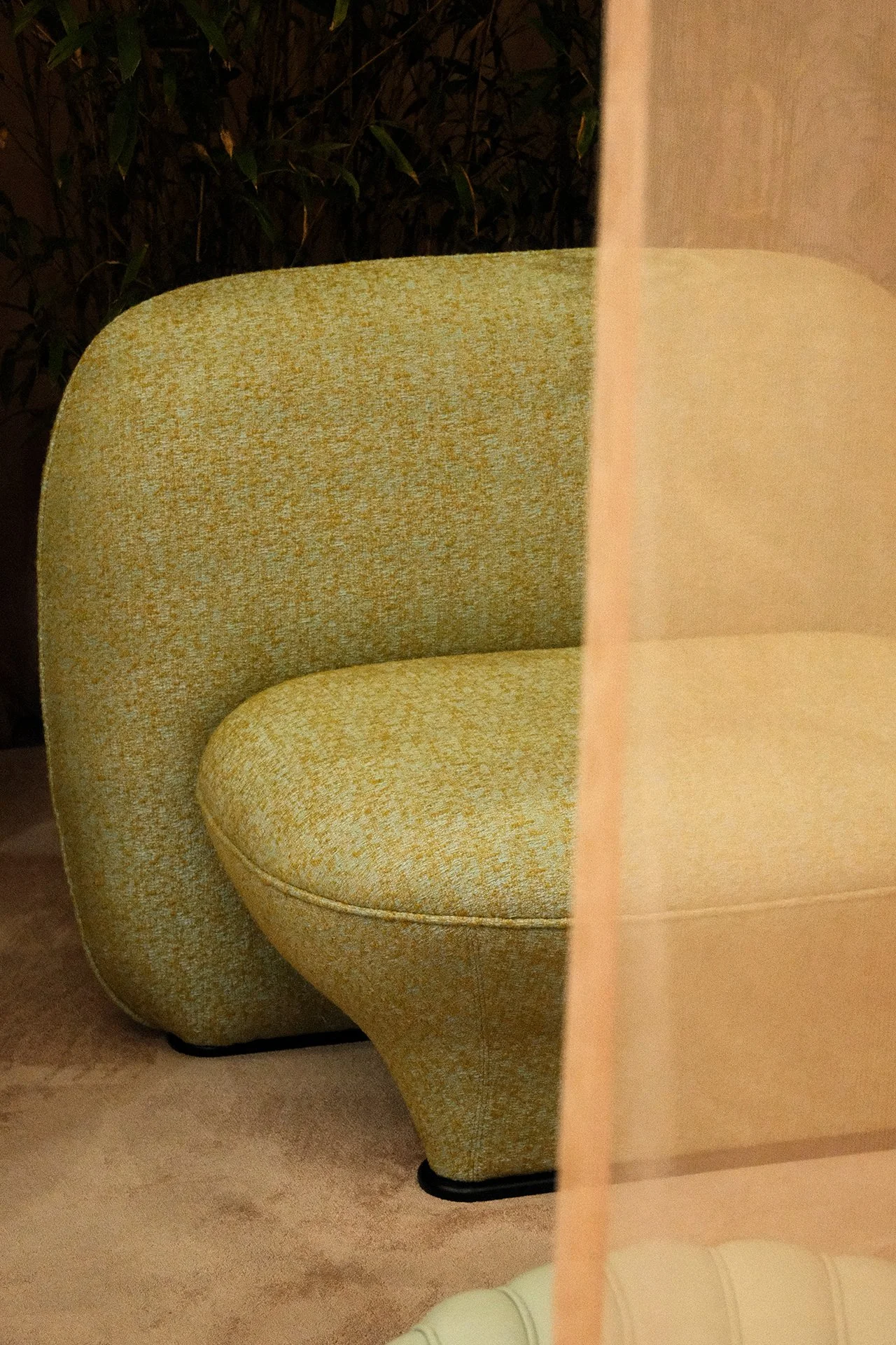 Yellow textured armchair with curved back and seat, partially obscured by a beige or peach curtain, with a dark background featuring greenery or plants.