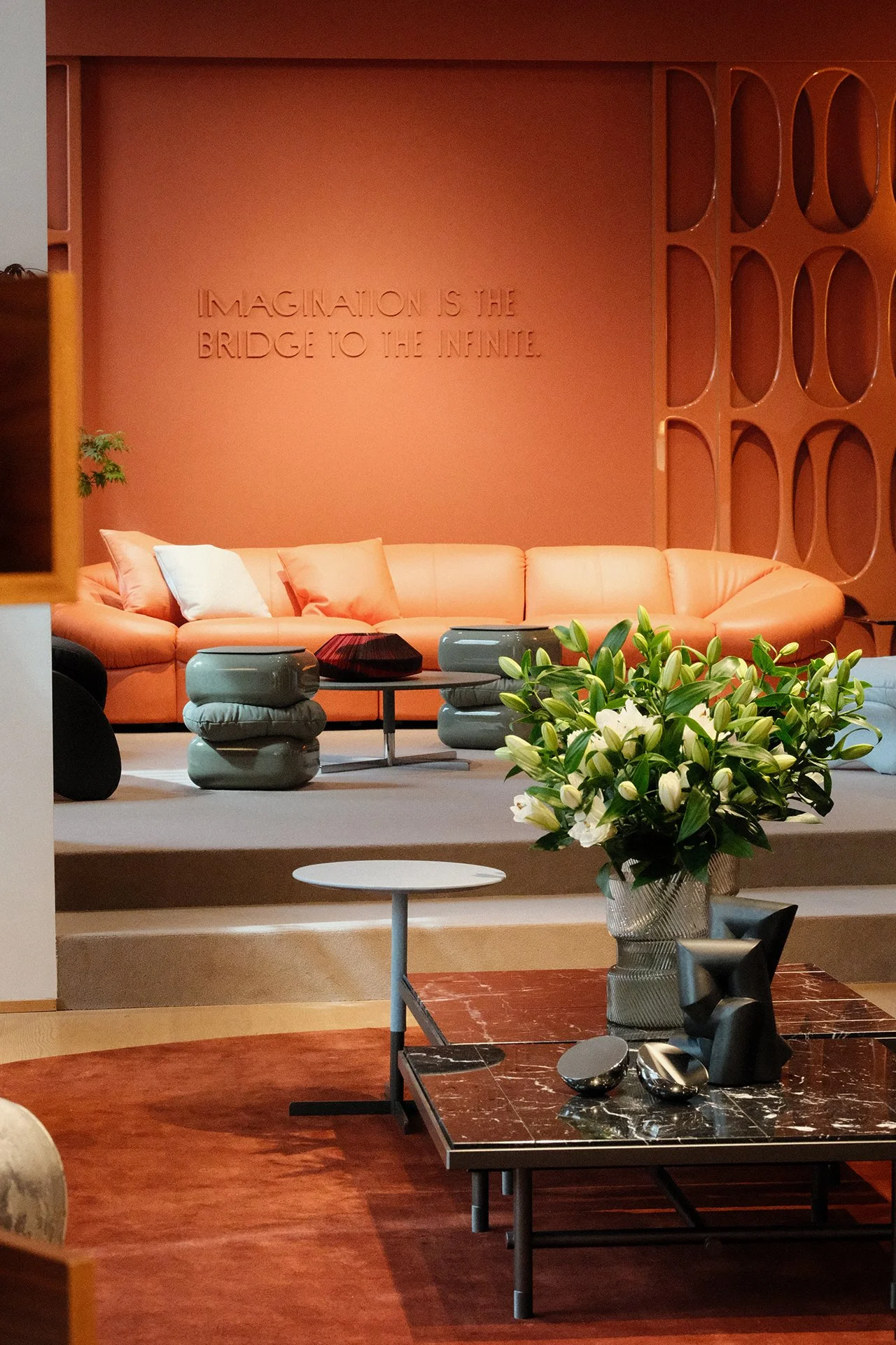 A modern interior with a coral-colored sofa, decorative pillows, a coffee table with various decor items, and a large flower arrangement with white lilies on a black marble table. A wall in the background features the quote 'IMAGINATION IS THE BRIDGE